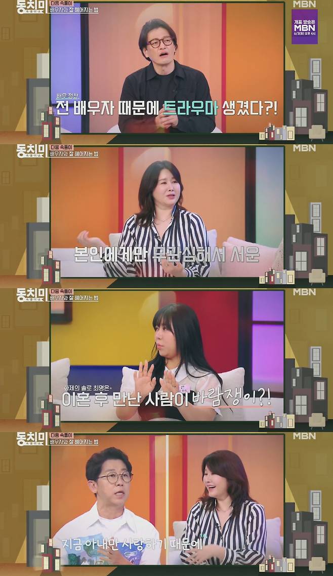 지난달 31일 MBN '속풀이쇼 동치미' 방송 말미에서는 배우 정찬, 배우 김지연, '나는 솔로' 10기 정숙 최명은 등이 출연하는 예고편이 공개됐다. 이날 이들은 '배우자와 잘 헤어지는 법'를 주제로 이야기를 나눴다.