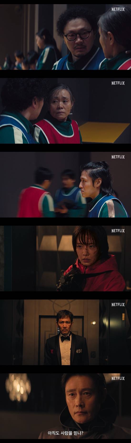 제발 게임을 그만하게 해 달라고 울며 호소하는 금자(강애심)와 "어떡하겠다는 건데, 여기 앉아서 죽겠다는 거야?"라고 준희(조유리)를 다그치는 명기(임시완)를 비롯한 참가자들의 절박한 모습에 이어, 다시 한번 456번을 달고 정장을 입고 들어서는 기훈과 마침내 가면을 벗고 자신의 정체를 그에게 드러내며 "456번, 아직도 사람을 믿나"라는 말을 건네는 프론트맨.