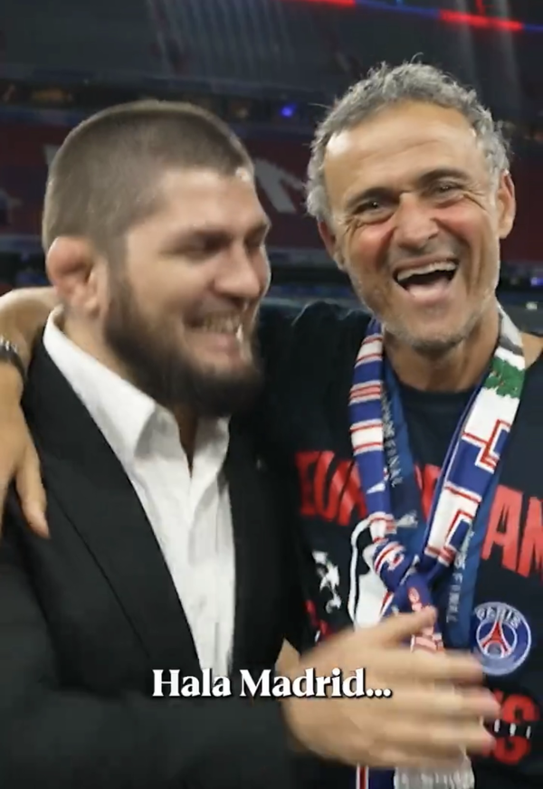 평소였다면 해서는 안 될 ‘짖궂은 도발 행위’를 한 하빕이었다. 그는 엔리케 감독과 함께 셀프 영상을 촬영하며 “하나 둘 셋! 할라 마드리드”라고 외쳤다. 이에 엔리케 감독은 “오 아니야 아니야!”라고 말하며 함박미소를 지었다. 할라 마드리드는 바르셀로나의 ‘라이벌’ 레알 마드리드의 응원 구호다.
