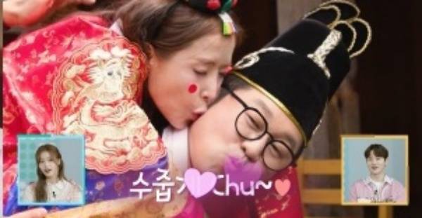지상렬과 신지가 혼례복을 입고 전통 혼례를 체험한 가운데, 역사적인 순간이 펼쳐졌다. 앞서 지상렬에게 "나랑 뽀뽀할 수 있어?"라며 돌발 발언을 했던 신지는 김용명과 박서진의 독촉에 용기를 내고 지상렬 볼에 뽀뽀를 해 모두를 놀라게 했다.