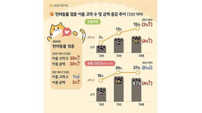 KB국민카드는 2021년부터 2024년까지 반려동물 업종(동물병원, 용품 전문점)에서 이용 경험이 있는 354만 명의 결제 데이터 2천485만 건을 분석한 결과를 1일 이처럼 밝혔습니다.