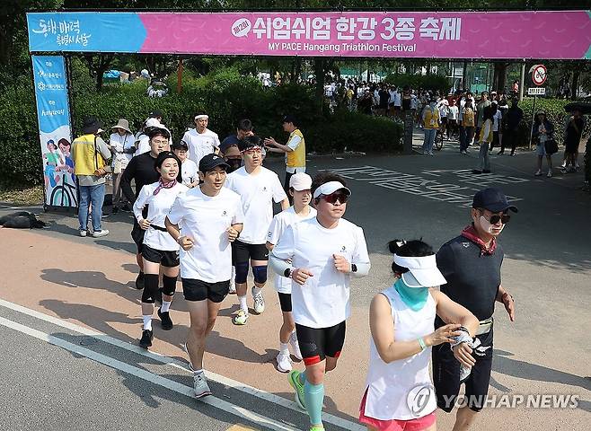 (서울=연합뉴스) 김성민 기자 = 1일 서울 광진구 뚝섬한강공원에서 열린 '제2회 쉬엄쉬엄 한강 3종 축제'에서 시민들이 달리기를 하고 있다. 2025.6.1