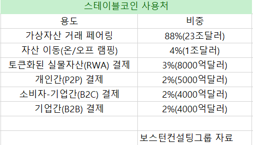 현재 스테이블코인은 대부분 거래소 통화로 사용된다. 보스턴컨설팅그룹(BCG)에 따르면 거래량의 88%(23조 달러)는 거래소 페어링 용도다. 가상자산거래소에서 다른 가상자산을 사거나 시세 차익 목적이 주된 쓰임새다. 가상자산에 대한 수요가 높을수록 코인을 구매하기 위한 스테이블코인 수요도 늘어나는 셈이다. 다음으로 비중이 큰 용도는 거래소와 개인 지갑 간 자산이동(온·오프램프) 용으로 전체 4%(1조 달러)를 차지한다. 이어 ▷토큰화 된 실물자산(RWA) 결제(3%․8000억달러) ▷개인간(P2P) 결제(2%․5000억달러) ▷소비자와 기업 간(B2C) 결제(2%․4000억달러) ▷기업간(B2B) 결제(2%․4000억달러) 순이다.