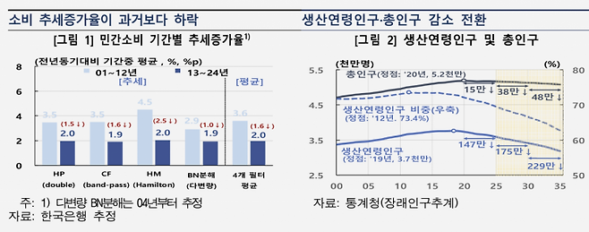 1일 한국은행 조사국·경제모형실은 '핵심 이슈-인구구조 변화가 소비 둔화에 미치는 영향' 보고서를 내고 이같이 강조했다. 최근 민간소비가 부진한 데는 경기적 요인뿐 아니라 구조적 요인의 영향도 크다. 2013~2024년 민간소비의 추세증가율은 과거(2001~2012년)와 비교해 1.6%포인트 낮아졌다. 박동현 조사국 구조분석팀 차장은 "소비의 추세적 둔화는 가계부채 누증, 소득 양극화 등 여러 구조요인이 복합적으로 작용한 결과지만, 특히 인구구조 변화는 우리 경제의 소득 창출 여력, 소비성향, 소비구성 변화 등을 통해 소비 추세에 지속적이고 중대한 영향을 미치고 있다"고 지적했다.