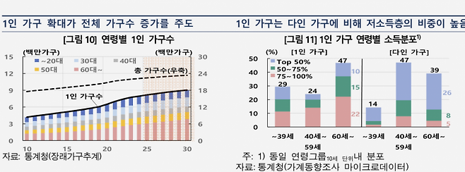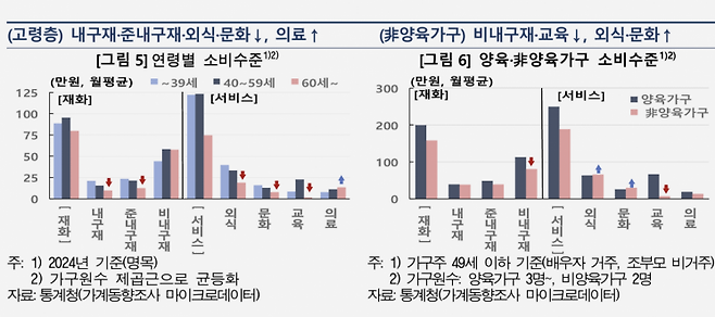 고령층의 소비수준은 은퇴 후 제한된 소득·사회활동 등으로 낮아지는 가운데 우리 경제 내 고령층 비중이 빠르게 늘어나면서 전체 소비 여력이 약화하고 있다. 소비구성 측면에서는 고령화가 특히 내구재·준내구재·외식·문화 등의 재량적 소비를 제약하는 것으로 나타났다. 박 차장은 "연령별 소비를 보면, 고령층 진입 이후 비내구재 식료품, 의료를 제외한 대다수 항목의 소비가 뚜렷하게 감소했다"며 "저출산은 양육 관련 필수적 소비항목인 비내구재, 교육 등에 부정적 영향을 미치는 모습을 보였다"고 말했다. 반면 외식·문화 등의 소비는 가구원 수가 적음에도 불구하고 비양육 가구의 소비수준이 오히려 높은 것으로 나타났다.