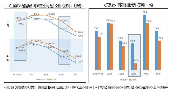 가장 크게 감소한 연령대는 60대로 2014년 69.3%에서 2024년 62.4%로 줄었다. 20·30대의 경우 월평균 소비액이 2014년 257만원에서 2024년 248만원으로 감소했다.