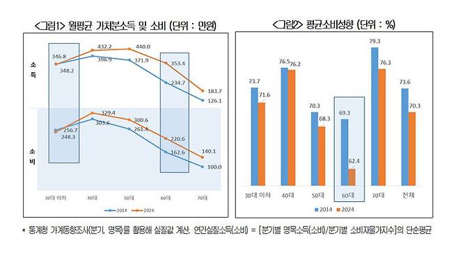 보고서에 따르면 10년 전과 비교해 30대 이하를 제외한 모든 연령대에서 소득은 증가했지만, 이에 비례해 소비 지출은 늘지 않았습니다.