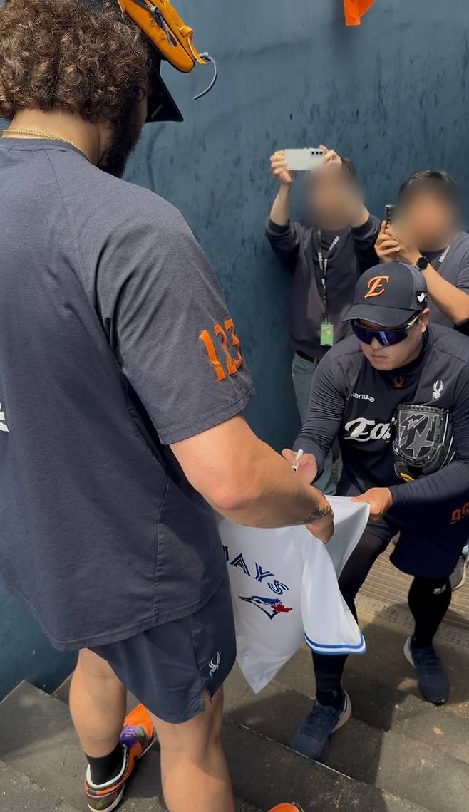 이렇게 폰세가 류현진의 유니폼을 구한다는 소식이 팬들에게도 널리 알려졌고, NC파크를 찾은 한 팬이 폰세에게 류현진의 토론토 시절 유니폼을 선물했다.