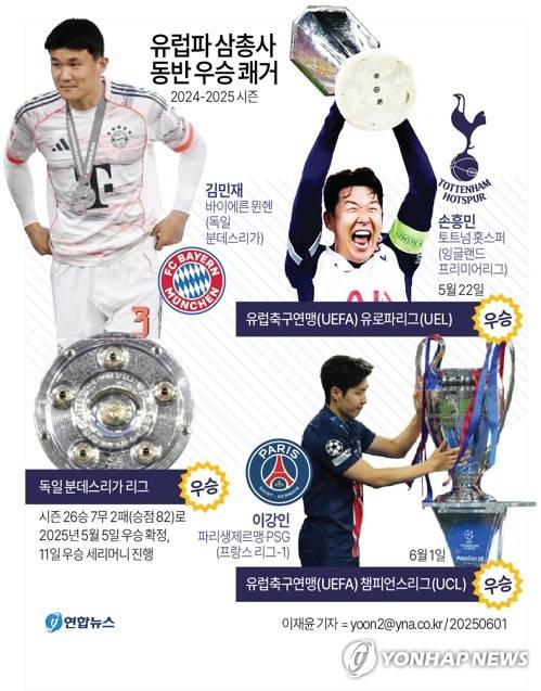 김민재(바이에른 뮌헨)의 독일 분데스리가 우승을 시작으로 국가대표팀 주장 손흥민(토트넘)이 UEFA 유로파리그(UEL) 우승을 달성하더니 이강인도 우승해 유럽파 삼총사의 동반 우승 서사가 완성됐다.