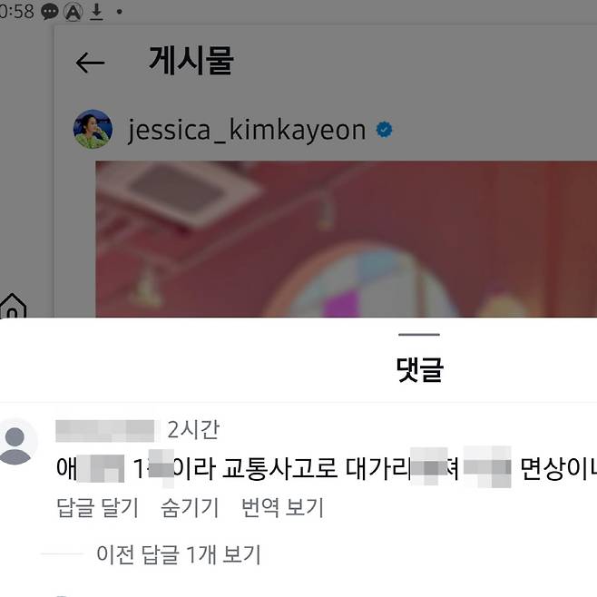 사진은 자신의 개인계정에 달리 악플을 캡처한 모습. 댓글에는 '애새X 1X이라 교통사고로 대가리깨져 X질 면상'라며 악담을 퍼붓고 있다. 이는 김가연은 이날 이재명 더불어민주당 대통령 선거 후보의 충북 충주 유세에 참석해 지지연설을 한 후 달린 것이다.