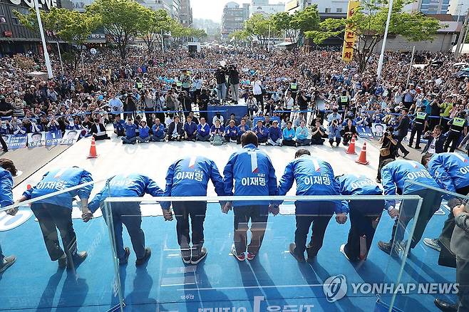 (울산=연합뉴스) 김주성 기자 = 더불어민주당 이재명 대선 후보가 막바지 '험지 공략'에 나선 1일 울산광역시 일산해수욕장 앞에서 시민들에게 인사하고 있다. 2025.6.1 [공동취재]