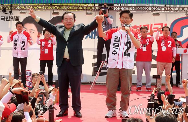 김문수 국민의힘 대선 후보가 1일 경기 남양주시 다산역 앞에서 이인제 전 경기도지사의 손을 잡고 유권자들에게 지지를 호소하고 있다.