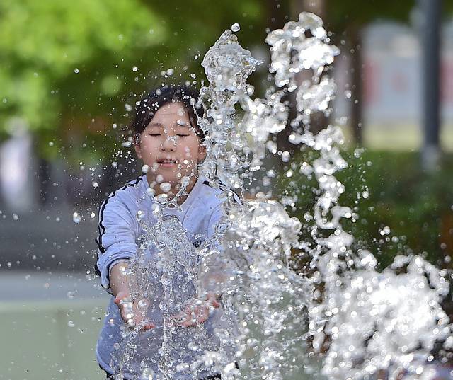 대구 낮 최고기온이 30℃를 웃돌며 무더위가 찾아온 1일 오후 대구 중구 수창공원 바닥분수에서 한 어린이가 물장난을 치며 더위를 식히고 있다.