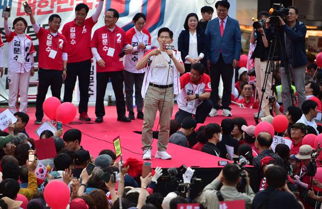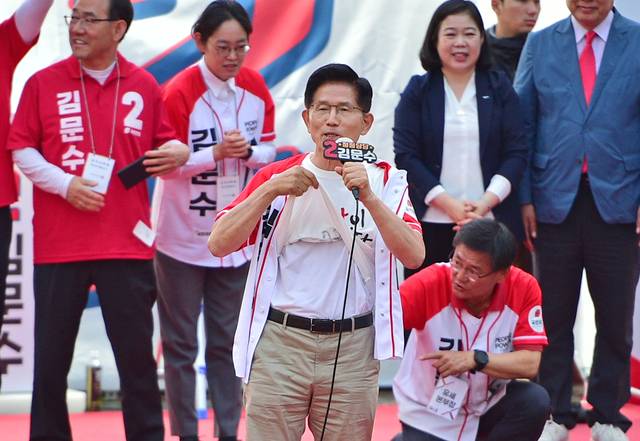 김문수 국민의힘 대통령 후보가 31일 오후 포항 북포항우체국 앞에서 열린 '승리로 가는 길' 집중유세에서 티셔츠를 과감히 올리며 "나는 방탄조끼를 착용하지 않는다" 라고 말하며 이재명 후보의 방탄조끼를 착용과 방탄유리 연설을 꼬집으며 "방탄법까지 만들어서 재판 안 받겠다는 이런 사람이 대통령이 되면 대한민국은 독재국가가 되는 것"이라고 비판하고 있다. 김진홍 기자 solmin@idaegu.com