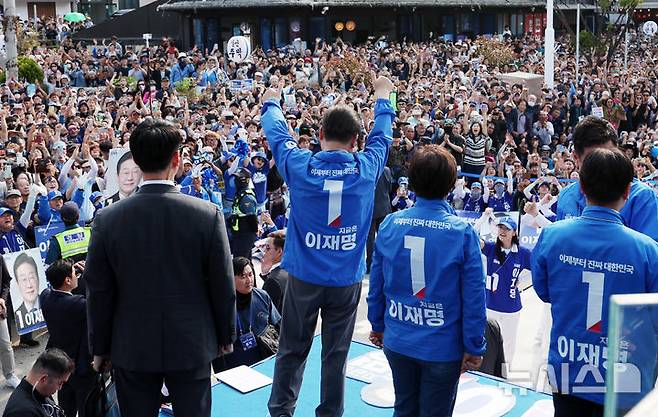 [울산=뉴시스] 조성우 기자 = 이재명 더불어민주당 대선후보가 1일 오후 울산 동구 일산해수육장 교차로 인근에서 열린 집중유세에서 시민들을 향해 인사하고 있다. 2025.06.01. xconfind@newsis.com