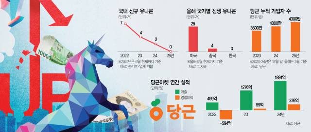 문제는 당근마켓과 같은 기존 유니콘의 성장 동력이 꺼져가는 상황에서 ‘제2의 당근마켓’과 같은 신규 유니콘이 탄생할 수 있는 환경도 갖춰지지 않아 점점 K유니콘 숫자가 줄어들고 있다는 것이다. 국내 신규 유니콘 수는 2022년 7개에서 2023년 4개, 지난해 2개로 급감했다. 올해는 아직 K유니콘이 탄생하지 않은 데다 가능성이 보이는 기업조차 현재로서는 눈에 띄지 않는다. 글로벌 시장조사 업체 피치북에 따르면 올해 1월부터 지난달 2일까지 미국과 중국에서 각각 25개, 4개의 신생 유니콘이 탄생할 동안 한국에서는 단 하나의 유니콘도 나타나지 않았다.