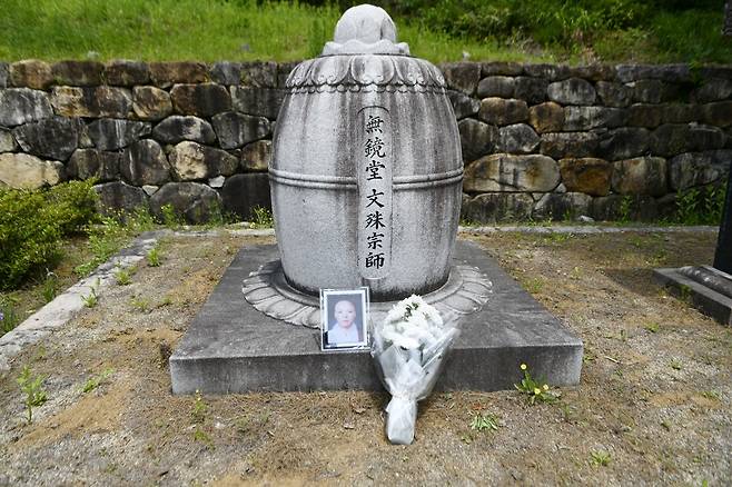| ▲ 31일 문수스님 15주기를 맞아 추모제를 준비하면서 누군가 스님의 부도탑 앞에 꽃다발을 놔둔 채 스님을 추모했다. |
