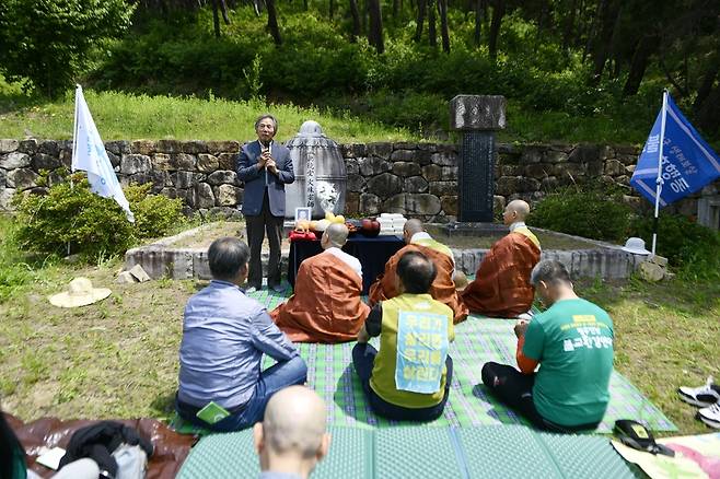 | ▲ 대구환경운동연합 박호석 대표가 문수스님 15주기를 맞아 스님을 추모하는 말씀을 전하고 있다. |