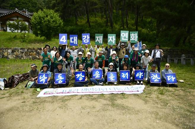 | ▲ 문수스님 15주기 추모제에 참가한 이들이 추모제를 마치고 스님의 유지를 받들어 "4대강 재자연화!, 낙동강은 흘러야 한다!" 외치고 있다. |