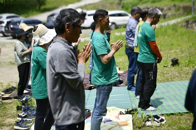 | ▲ 문수스님 15주기 추모제에 참가한 이들이 합장을 한 채 스님의 유지를 받들 것을 맹세하고 있다. |