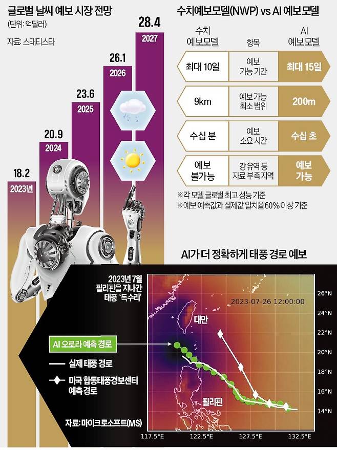 아직까지는 예보 시장이 크지 않다. 시장조사업체 스태티스타에 따르면 세계 예보 시장 규모는 올해 23억6100만달러(약 3조2350억원) 정도로 예상된다. 날씨 정보가 공공재 성격이 강한 데다 해외 빅테크도 ‘돈벌이’보다 AI 기술 고도화를 위해 투자하기 때문이다. 하지만 시장의 성장 잠재력은 큰 것으로 분석된다.