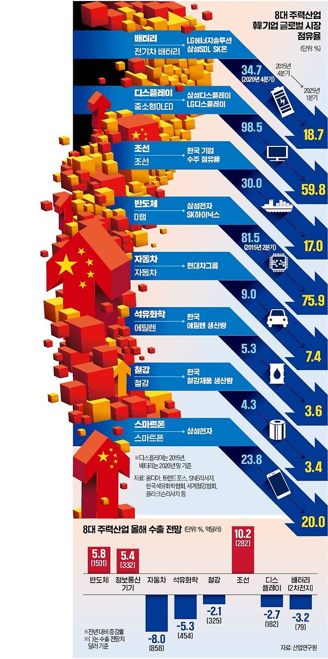 1일 옴디아, SNE리서치 등 국내외 시장조사업체에 따르면 지난 10년간 국내 8대 주력 산업의 글로벌 시장 점유율은 일제히 하락했다. 지난해 한국 수출(6383억달러)의 63%(4005억달러)를 차지한 8대 산업이 무너지면 성장률 하락은 피할 수 없다.