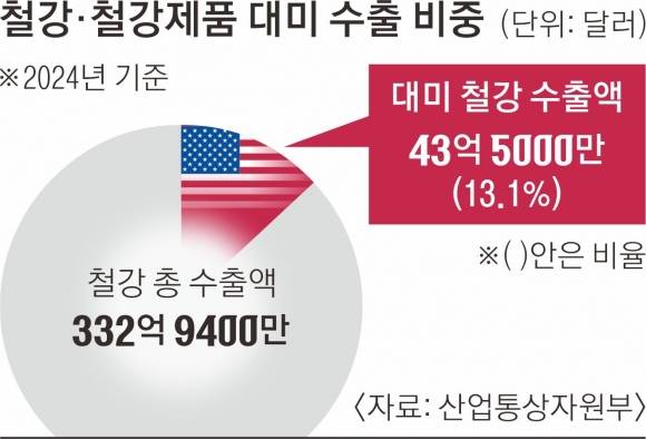 1일 산업통상자원부에 따르면 지난해 대미 철강 수출액은 43억 5000만 달러로 전체 철강 수출액(332억 9400만 달러)의 13.1%를 차지했다. 전체 대미 수출액(1277억 9100만 달러)으로 보면 3.4% 수준이다. 미국 입장에서 한국은 캐나다, 멕시코, 브라질에 이어 네 번째 철강 수입국이다. 철강업계 관계자는 “이번 조치가 가져올 영향에 대해 모니터링하고 있다”면서 “50%로 올리면 수요 위축으로 수출 자체가 사실상 차단되는 것 아니냐”고 우려했다.