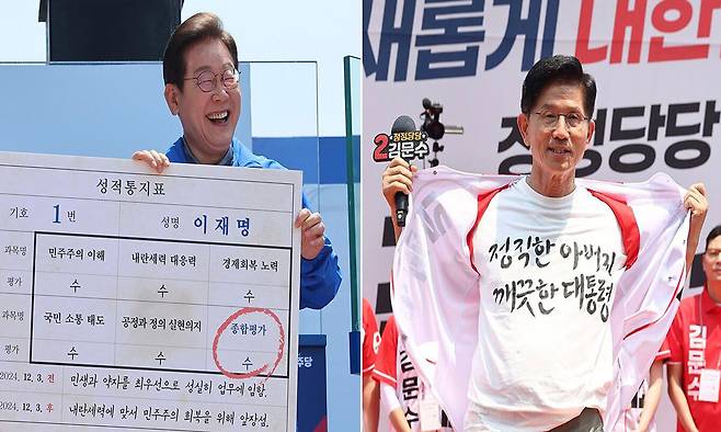| ‘대선 모의 성적표’ 받은 李… “방탄복 안 입었다” 외친 金 더불어민주당 이재명 대선후보가 1일 고향인 경북 안동 웅부공원 유세 현장에서 초등학교 은사로부터 ‘수’ 등급이 적힌 대선후보 모의 성적통지표를 받은 뒤 환하게 웃고 있다(왼쪽 사진). 같은 날 국민의힘 김문수 후보는 서울 강남구 코엑스 유세에서 웃옷을 벗어 방탄복을 착용하지 않았음을 시민들에게 보여주며 진정성을 호소했다. 안동·서울=연합뉴스·허정호 선임기자 |