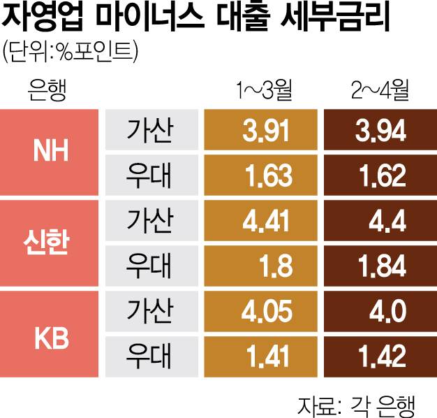 NH농협은행의 경우 개인사업자의 신용대출 가산금리도 올렸다. 2~4월 신규 취급액 기준 가산금리는 3.92%포인트로 전달(1~3월)의 3.85%포인트에 비해 0.07%포인트 상승했다. 우대금리는 1.41%포인트에서 1.39%포인트로 되레 감소했다.