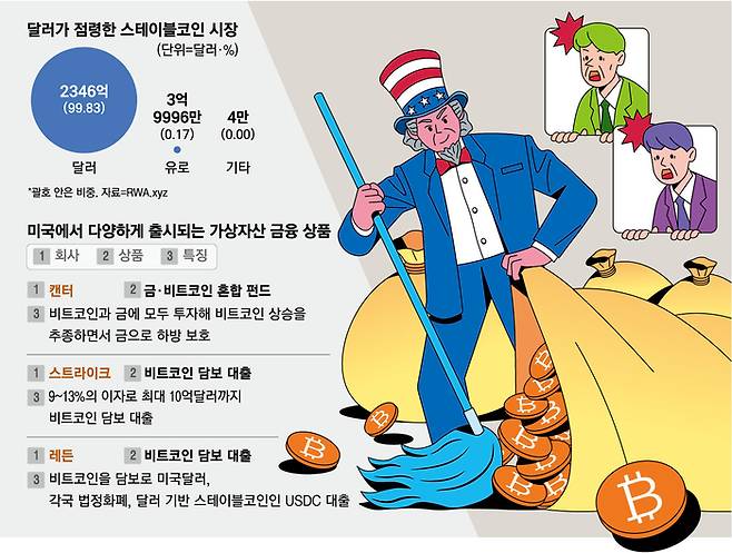이미 달러화에 연동된 스테이블코인의 점유율이 압도적이다. 1일 블록체인 분석 사이트 ‘rwa.xyz’에 따르면 전체 스테이블코인 시가총액은 2350억달러인데 이 중 99.79%인 2346억달러가량을 달러 스테이블코인이 차지하고 있다. 특히 도널드 트럼프 미국 대통령이 취임한 이후 스테이블코인 규모는 2075억달러에서 2350억달러로 13.25% 급증했다.