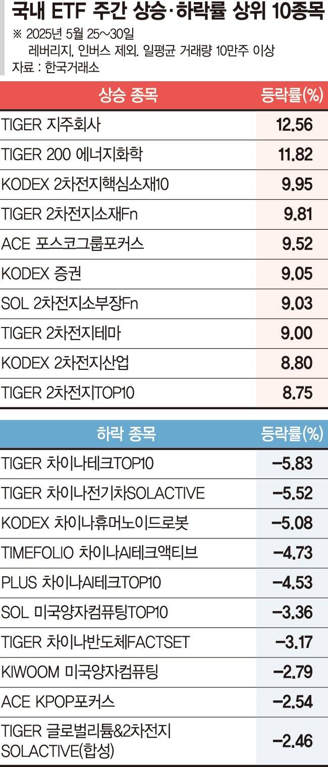 1일 한국거래소에 따르면 지난 한 주(5월 26~30일) 간 가장 높은 상승률을 기록한 ETF는 12.56% 급등한 'TIGER 지주회사'다. 지주사 관련 ETF가 큰 폭으로 상승한 데에는 대선 후보들의 증시 부양 관련 공약이 이어져 지배구조 개선에 대한 기대감이 컸다.