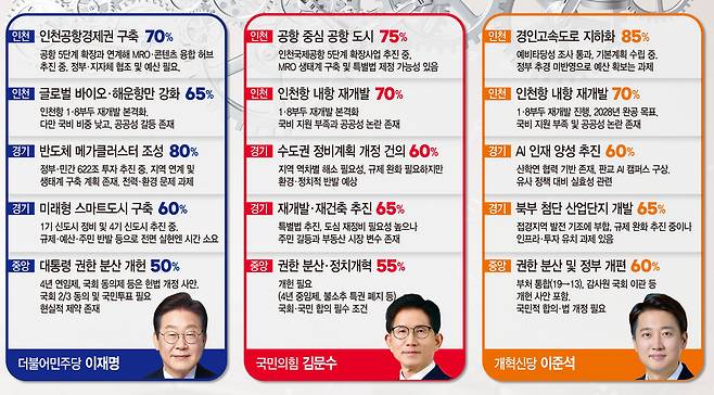 지금까지 발표된 대선 공약 중 이재명 더불어민주당 후보, 김문수 국민의힘 후보, 이준석 개혁신당 후보가 제시한 인천·경기 맞춤형 공약을 각각 2개씩 선정해 분석 대상으로 삼았다. 여기에 이번 대선의 핵심 과제 중 하나인 '제왕적 대통령제 해소'와 관련된 대통령 권한 분산 공약도 함께 살펴봤다.