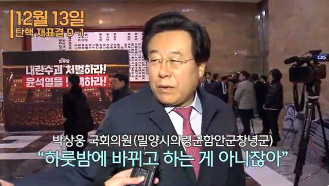 다음 날, MBC경남 기자가 다시 국회에서 박 의원을 만났다. "여전히 탄핵 소추안 표결 관련 당론에 따르겠다는 입장이냐"고 물었다. 박 의원은 "당론이라는게 하룻밤에 바뀌고 하는 게 아니잖냐"면서 "나 혼자 생각도 아니고 여러 사람의 생각"이라고 강조했다.