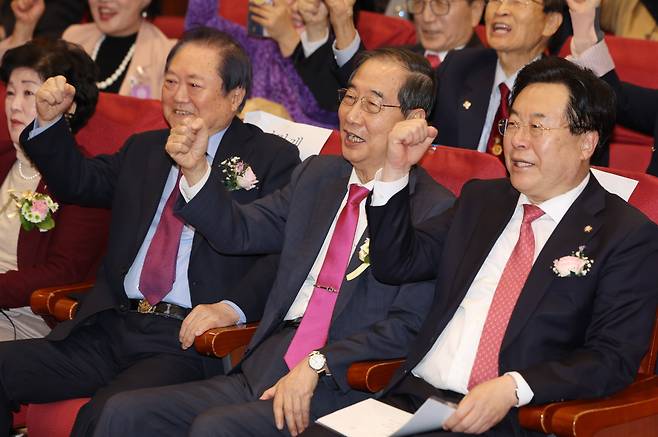 | ▲ 2024년 11월 19일, 한덕수 당시 국무총리가 서울 여의도 국회 의원회관에서 열린 '세계역사주도 초일류국가 어떻게 만들 것인가?' 특별 강연회에서 구호를 외치고 있다. 왼쪽부터 이건개 변호사, 한덕수 총리, 국민의힘 박상웅 의원. |