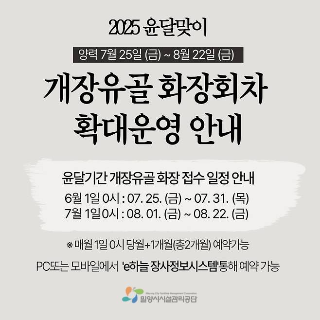 밀양시시설관리공단은 윤달 기간 중 개장 유골 화장 수요 급증에 대비해 7월25일부터 8월22일까지 밀양시공설화장시설의 개장 화장 횟수를 기존 하루 3구에서 최대 12구로 확대 운영한다.