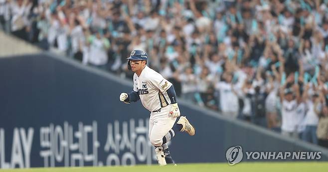 (창원=연합뉴스) 김동민 기자 = 1일 경남 창원NC파크에서 열린 프로야구 2025 신한 SOL 뱅크 KBO리그 한화이글스와 NC다이노스 경기. 6회 말 2사 만루 상황 대타 NC 오영수가 만루홈런을 치고 그라운드를 돌고 있다. 2025.6.1