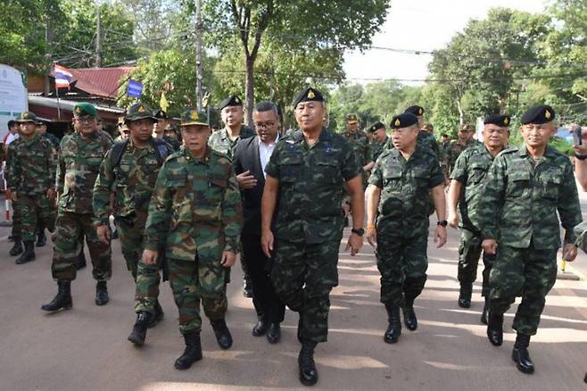 | ▲ 태국 육군 총사령관 파나 끌레우쁠롯툭 대장(앞줄 오른쪽)과 캄보디아 왕립육군 사령관 마오 쏘판 대장(앞줄 왼쪽)이 5월 29일 태국 수린 주 깝쭈엉 지구에 위치한 촁촘 검문소를 군 관계자들과 함께 시찰하고 있다. |