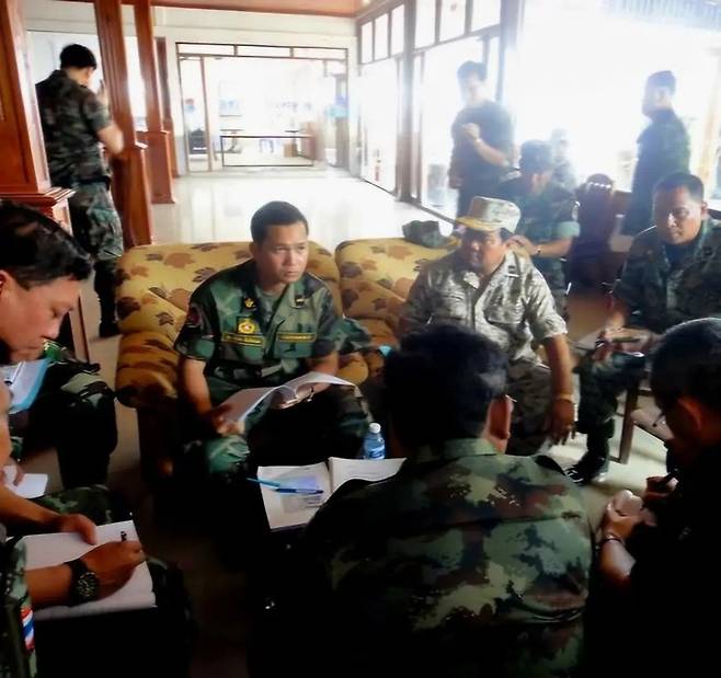 | ▲ 지난 2008년 캄보디아-태국 국경지대에서 벌어진 무력충돌 당시 캄보디아군을 진두지휘하던 훈 마넷 장군(가운데, 현 총리)이 참모들과 작전 회의를 하고 있는 모습. 훈 마넷 총리는 지난 5월 28일 양국간 무력 충돌 직후 이 사진을 자신의 페이스북에 올렸다. |
