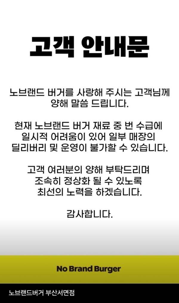 노브랜드버거 관계자는 “공장에서 공급받은 번을 가맹점에 우선 제공하고자 일부 직영점의 영업 및 배달을 중단하는 등의 노력을 하고 있다”며 “다른 공급사 확보와 자체 생산도 적극 검토 중이며 자체 생산은 일주일 내에 시작할 수 있을 것으로 예상된다”고 말했다.
