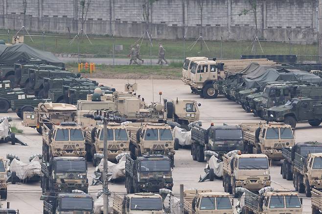 | ▲ 미국 언론이 미 정부가 주한미군 감축을 검토하고 있다고 보도한 23일 오전 경기도 동두천시의 주한미군 기지에서 미군 차량이 대기하고 있다 |