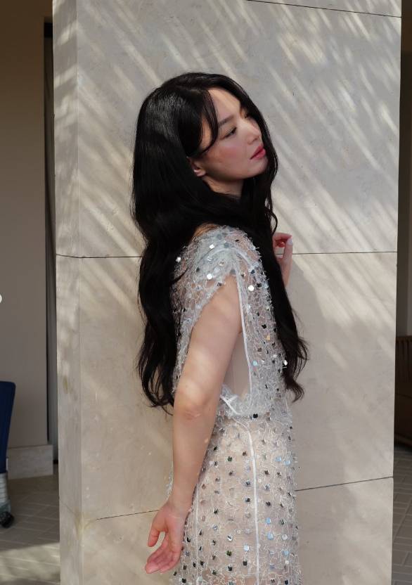 신민아가 착용한 시퀸 드레스는 몸매가 드러나는 시스루 소재로 제작되어 고혹적이면서도 우아한 분위기를 연출했다. 드레스의 실버 톤 시퀸 장식은 조명과 햇빛에 따라 다양한 빛깔을 발산하며 신민아 특유의 단아한 미모를 한층 돋보이게 했다. 어깨를 살짝 드러낸 드레스는 그의 우아한 쇄골 라인을 강조했다.