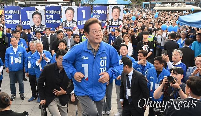 | ▲ 이재명 더불어민주당 대선 후보가 1일 부산 동구 부산역 광장에서 유권자들에게 지지를 호소하고 있다. |