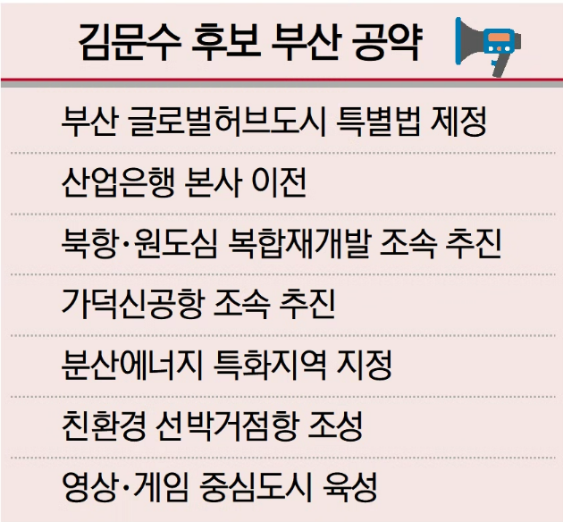 김 후보가 핵심 공약으로 내세운 ‘부산 글로벌허브도시 특별법’은 부산을 금융·물류·산업 거점으로 육성하겠다는 구상이다. 해당 법안은 부산 정치권과 부산시가 함께 요구해 온 현안으로, 지난해 여야 의원 18명이 공동 발의한 바 있다.