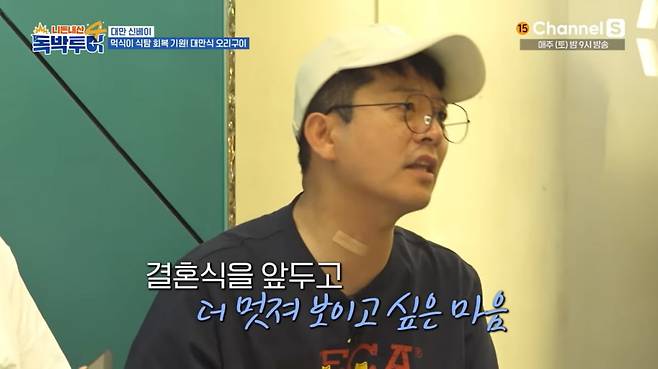 '먹식이' 김준호는 평소와 달리 그다지 음식에 관심을 보이지 않았다. 살 빼는 이유를 묻자 김준호는 "버진로드를 그래도 (멋있게 걸어야 하지 않나")라며 "턱시도를 맞추러 갔는데 배 때문에 맞는 게 없다. 허리 34인치인데 32인치로 맞춰놨다. 내가 알아서 빼겠다고 약속해놨다"라고 답했다.