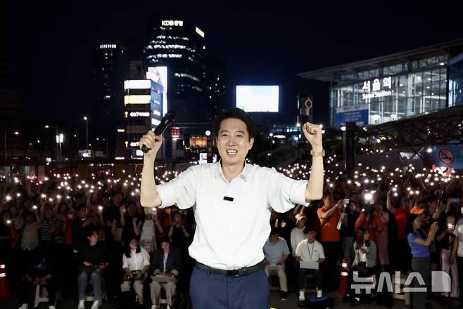 [서울=뉴시스] 조성봉 기자 = 이준석 개혁신당 대선후보가 1일 오후 서울 중구 서울역광장에서 유세를 마치고 취재진을