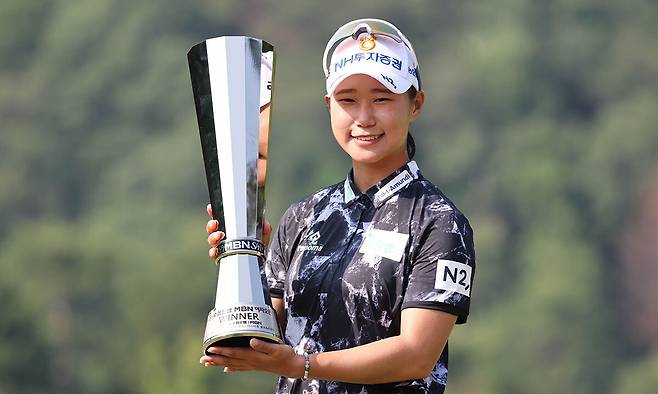 | 3년 만에 품은 트로피 정윤지가 1일 경기 양평군 더스타휴 골프&리조트에서 열린 KLPGA 투어 Sh수협은행 MBN 여자오픈에서 우승한 뒤 트로피를 들고 밝게 웃고 있다. KLPGA 제공 |