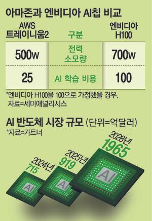 AWS는 AI 모델 클로드를 만드는 앤트로픽과 손잡고 ‘레이니어 프로젝트’라는 대규모 데이터센터 클러스터를 구축하고 있다. 시장조사 기관 가트너에 따르면 AI 반도체 시장 규모는 올해 919억5500만달러(약 127조2500억원)에서 2028년 1965억달러(약 272조원)로 성장할 전망이다.