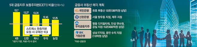 현재 5대 금융지주(KB·신한·하나·우리·NH농협) 기준으로는 보통주자본 비율이 규제 기준인 9%보다 높은 상황이다. 하지만 주요 은행과 금융지주는 연말 금융당국이 스트레스완충자본을 도입해 규제선을 11.5%까지 높일 것을 대비하고 있다. 까딱하다간 제재 대상이 된다는 위기감에 선제적으로 부동산부터 내다 팔고 있는 것이다. 보통주자본을 다소 과할 정도로 쌓아두는 게 안전하다는 공감대도 퍼지고 있다. 한 금융지주 관계자는 “경기 침체가 장기화하며 금융그룹이 인수·합병(M&A) 시장에서 역할을 해줘야 하는 상황인데 모두 보통주자본 비율을 맞추느라 적극적으로 나서지 못하고 있다”며 “유휴 부동산 매각을 통해 이 비율을 안전선까지 높이면 투자에 여력이 생길 것”이라고 전했다.