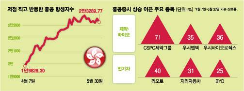 증권업계에서는 중국증시보다 저평가된 홍콩증시에 대한 재평가가 이뤄지며 항셍지수가 연내 2만5200선을 돌파할 것이라는 전망을 내놓고 있다. 항셍지수는 미·중 관세전쟁으로 저점으로 추락했던 지난 4월 7일 이후 5월 말까지 17.46% 회복한 것으로 나타났다.