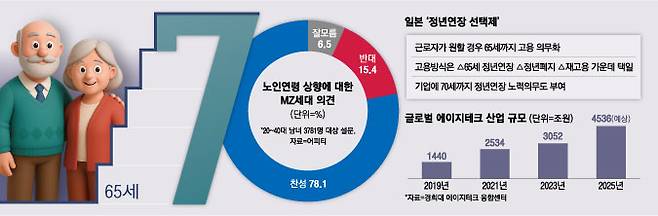 지난해 대한노인회가 노인 연령 상향을 제안한 데 이어 MZ세대에서도 같은 의견이 힘을 얻고 있다. 매일경제와 어피티가 지난 3월 20~40대 남녀 3781명을 대상으로 실시한 설문에서 응답자의 78.1%가 노인 기준 연령 상향에 찬성한다고 밝혔다. 응답자 81.5%는 ‘만 70세 이상’을 적정 노인 나이로 꼽았다.